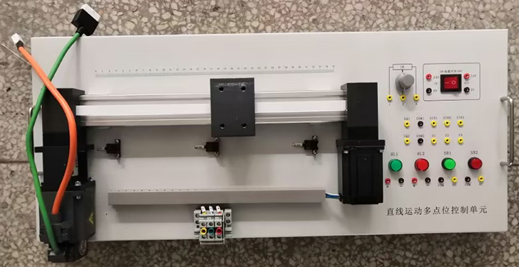11.小車(chē)運(yùn)動(dòng)控制實(shí)訓(xùn)裝置(實(shí)物):由運(yùn)動(dòng)小車(chē)、滾珠絲桿傳動(dòng)機(jī)構(gòu)、伺服電機(jī)及驅(qū)動(dòng)器、光電傳感器、接近開(kāi)關(guān)、開(kāi)關(guān)電源等組成,通過(guò)傳感檢測(cè)、PLC編程,實(shí)現(xiàn)傳動(dòng)控制、鍵值優(yōu)化比較行走控制、定向控制、定位控制、加減速控制、報(bào)警運(yùn)行控制、點(diǎn)動(dòng)控制、位置顯示控制,該系統(tǒng)外觀精美,體積緊湊,重量輕,堅(jiān)固又相對(duì)精巧,行程范圍:0.6米,裝有4只光電傳感器、5只接近開(kāi)關(guān)和2只行程開(kāi)關(guān)進(jìn)行位置反饋。
