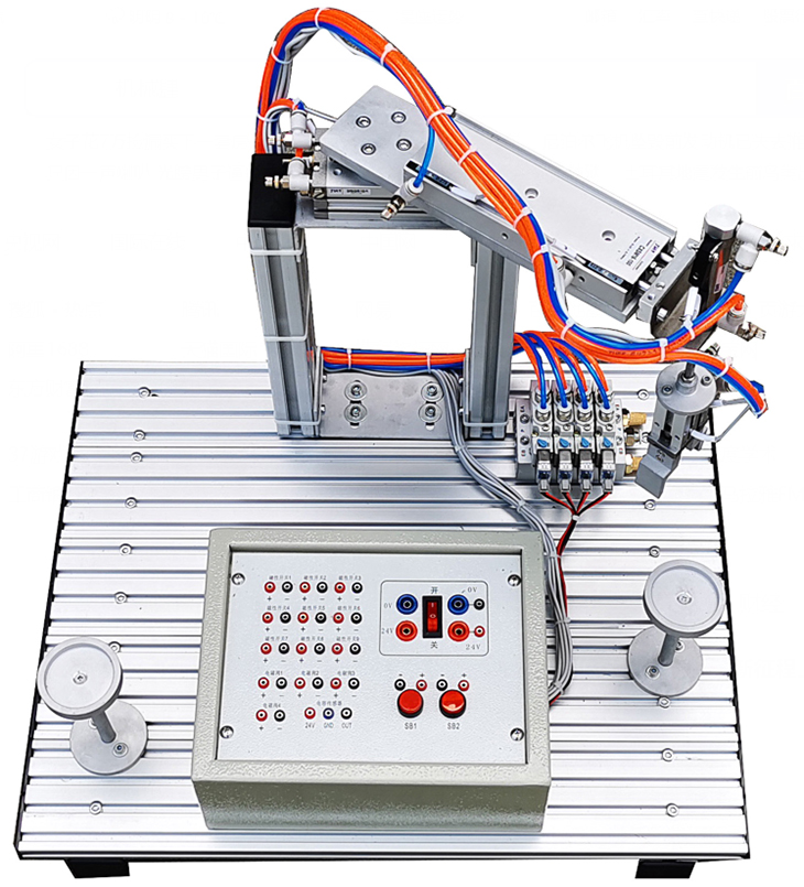 17、氣動(dòng)機(jī)械手實(shí)訓(xùn)模型(實(shí)物):本實(shí)訓(xùn)模型是一套完整的氣動(dòng)機(jī)械手搬運(yùn)裝置,由安裝底板、氣動(dòng)手指、單桿提升氣缸、雙導(dǎo)桿伸縮氣缸、旋轉(zhuǎn)擺動(dòng)氣缸、多種類(lèi)型磁性傳感器、多種類(lèi)型電磁閥、空氣過(guò)濾器、氣源控制滑閥及接線端子排等組成。主要完成物料的搬運(yùn)功能,氣動(dòng)機(jī)械手通過(guò)前臂下降,氣動(dòng)手指夾緊物體,手臂縮回,手臂右擺,手臂前伸,前臂下降,手爪松開(kāi)將物體放到指定位置等動(dòng)作后,機(jī)械手返回原位。將電磁閥及磁性開(kāi)關(guān)等元件的引出線連接到相應(yīng)的端子接線排上,方便使用。能滿足職業(yè)院?删幊炭刂破、機(jī)電一體化、氣動(dòng)技術(shù)等相關(guān)課程的實(shí)訓(xùn)教學(xué)、控制電源:DC