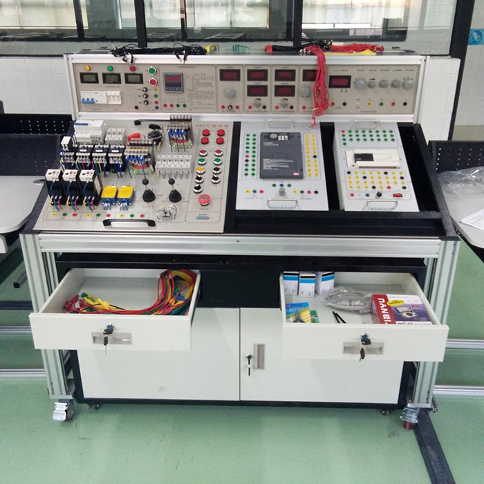 2、合理結(jié)構(gòu):設(shè)備以標(biāo)準(zhǔn)的配電柜為主柜,利用柜體的雙面空間,科學(xué)地布置電器及配套實(shí)驗(yàn)器材。該柜設(shè)計(jì)合理,實(shí)操方便,一柜多用,所有電器元件接點(diǎn)都已接到接線端子上,學(xué)生只需在接線端子上接線實(shí)驗(yàn),延長(zhǎng)了電器元件使用壽命、降低了材料損耗。