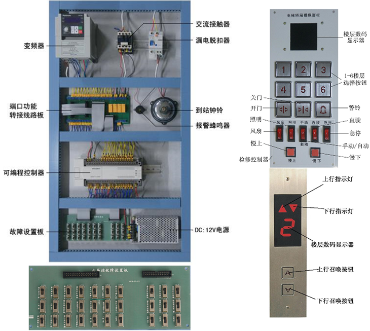 電梯電氣控制部分:電源空氣開關(guān)(漏電脫扣器)、DC12V驅(qū)動電源、PLC可編程控制器、接線端口電路板、到站鐘、變頻器、報(bào)警蜂鳴器。
