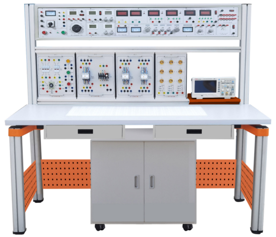 裝置由主機箱、實驗桌、實訓屏、實訓掛箱、移動矮柜、示波器架、學生凳等組成。實訓裝置支架與實訓桌可組合、可拆裝。支架與桌腳一體,鋁合金結構,實訓掛箱、各實驗模塊可根據實驗需求自由組合放置。