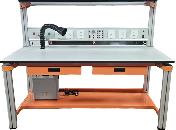 電子基本技能實(shí)訓(xùn)考核裝置由儀器架、電源控制箱、實(shí)驗(yàn)桌、焊錫煙霧凈化機(jī)、學(xué)生凳等組成。實(shí)驗(yàn)裝置支架與實(shí)驗(yàn)桌可組合、可拆裝。支架與桌腳一體,鋁合金結(jié)構(gòu)。