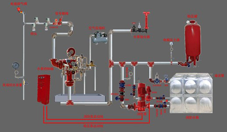 預(yù)作用系統(tǒng)是將火災(zāi)自動探測報警技術(shù)和自動噴水滅火系統(tǒng)有機(jī)地結(jié)合起來,對保護(hù)對象起了雙重保護(hù)作用。預(yù)作用系統(tǒng)由閉式噴頭、管道系統(tǒng)、雨淋閥、濕式閥、火災(zāi)探測器、報警控制裝置、充氣設(shè)備、控制組件和供水設(shè)施部件組成。這種系統(tǒng)平時呈干式,在火災(zāi)發(fā)生時能實(shí)現(xiàn)對火災(zāi)的初期報警,并立刻使管網(wǎng)充水將系統(tǒng)轉(zhuǎn)變?yōu)闈袷。系統(tǒng)的這種轉(zhuǎn)變過程包含著預(yù)備動作的功能,故稱為預(yù)作用噴水滅火系統(tǒng)。
