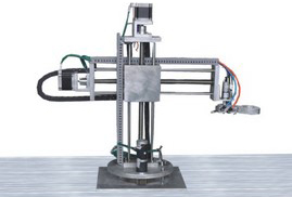 搬運(yùn)機(jī)器人:檢測(cè)單元檢測(cè)到產(chǎn)品分類信息時(shí),通過通信網(wǎng)絡(luò)將檢測(cè)結(jié)果傳送到該站,該站通過坐標(biāo)式氣動(dòng)機(jī)器人將從生產(chǎn)線上送來的成品送往全自動(dòng)堆垛機(jī),主要由四自由度氣動(dòng)機(jī)械手組成,電氣控制部分由PLC完成。
