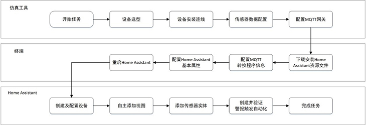 圖:智能家居課程案例,使用自動化智能家居平臺Home Assistant,對安裝好的感知層設備進行數(shù)據的瀏覽和各種自動或手動的執(zhí)行操作。