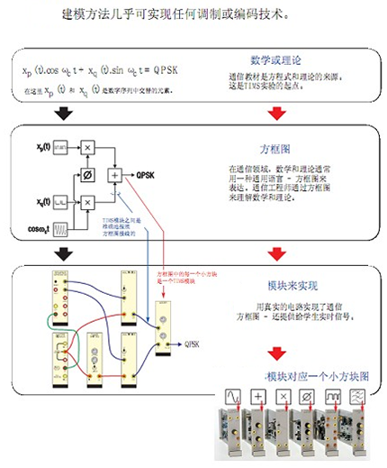 通信系統(tǒng)原理實驗室主要設備采用設計型開放式設計理念,跟以往驗證型實驗設備有本質區(qū)別。整個系統(tǒng)采用基于方框圖的模塊化設計,以數(shù)學函數(shù)方框圖形式來確定硬件基本模塊,靈活組合模塊以實現(xiàn)任何調制或編碼技術。