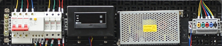 組成:三相四線漏電保護開關、380V指示儀表、開關電源、即插即用端子、雙層端子、保險絲端子,導軌;