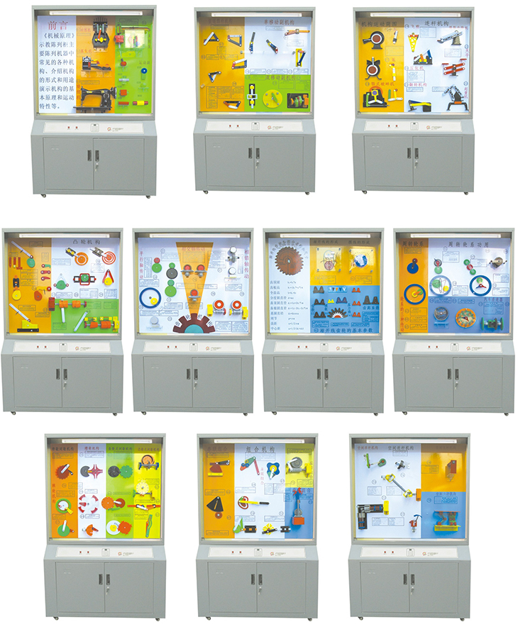 《機(jī)械原理》示教陳列柜是根據(jù)大、中專院校、技校、職業(yè)學(xué)校的機(jī)械原理教學(xué)大綱設(shè)計(jì)的電化教學(xué)設(shè)備。本陳列柜共分十個(gè)柜,具有多功能語(yǔ)音播放控制系統(tǒng)。語(yǔ)音解說(shuō)同步演示,采用單獨(dú)驅(qū)動(dòng)由電腦或電子設(shè)備控制運(yùn)轉(zhuǎn)演示,可由遙控控制順序自動(dòng)運(yùn)行講解,又能根據(jù)教材、教學(xué)需要而遙控任意選擇還是單獨(dú)演示。柜體采用SPCC冷扎板焊成,堅(jiān)固美觀,表面采用中溫磷化防銹漆、平光漆,靜電噴涂。模型材料采用進(jìn)口有機(jī)板制造,板面附有必要的圖表和文字說(shuō)明,演示形象逼真,運(yùn)行可靠,制作工藝美觀,使用本陳列柜可提高教學(xué)效果,節(jié)約學(xué)時(shí)是一套現(xiàn)代化機(jī)械課程教學(xué)應(yīng)用實(shí)驗(yàn)室設(shè)備。