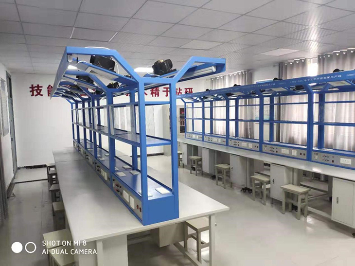 實訓臺上提供日光燈(用于照明)2個,透明的PVC板4個,可夾放原理圖等資料,另外還配備三芯雙聯(lián)暗插座4個、兩芯暗插座2個、工具柜2個,工作臺面設有綠色防靜電桌墊,整個裝配線安全可靠。