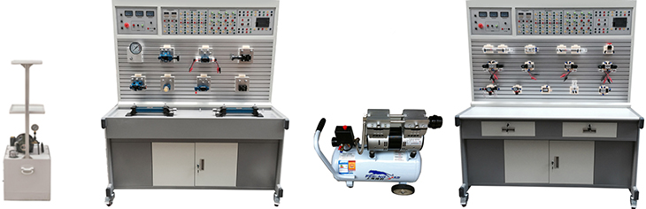 實驗教學用液壓氣動實驗臺(實用型)采用"二合一"結(jié)構(gòu),配備兩套實驗設(shè)備,一套為氣動與PLC實驗平臺,另一套為液壓傳動與PLC實驗平臺,且各自配有獨立的PLC電氣控制設(shè)備。