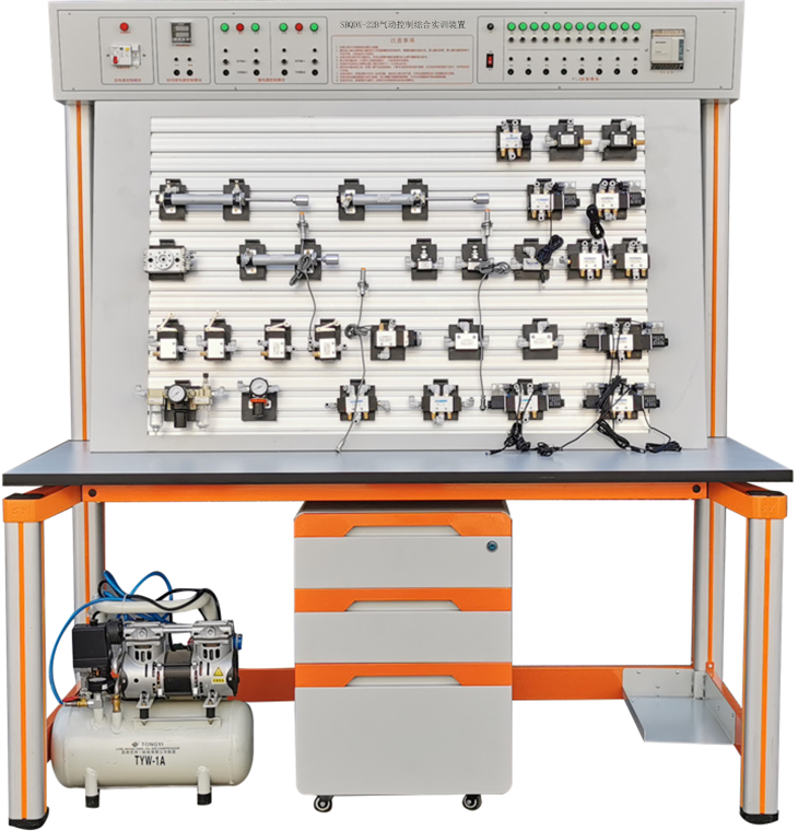 實驗臺由實驗桌、實驗操作區(qū)、網(wǎng)孔工具掛板、靜音氣泵、常用氣動元件、主控機箱、電腦桌等幾部分組成。