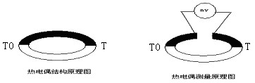 將兩種不同材質(zhì)的金屬導(dǎo)線連接成閉合回路,如果兩接點(diǎn)的溫度不同,由于金屬的熱電效應(yīng),在回路中就會產(chǎn)生一個與溫差有關(guān)的電動勢,稱為溫差電勢。在回路中串接一毫伏表,就能粗略地測出溫差電勢值。如圖1: