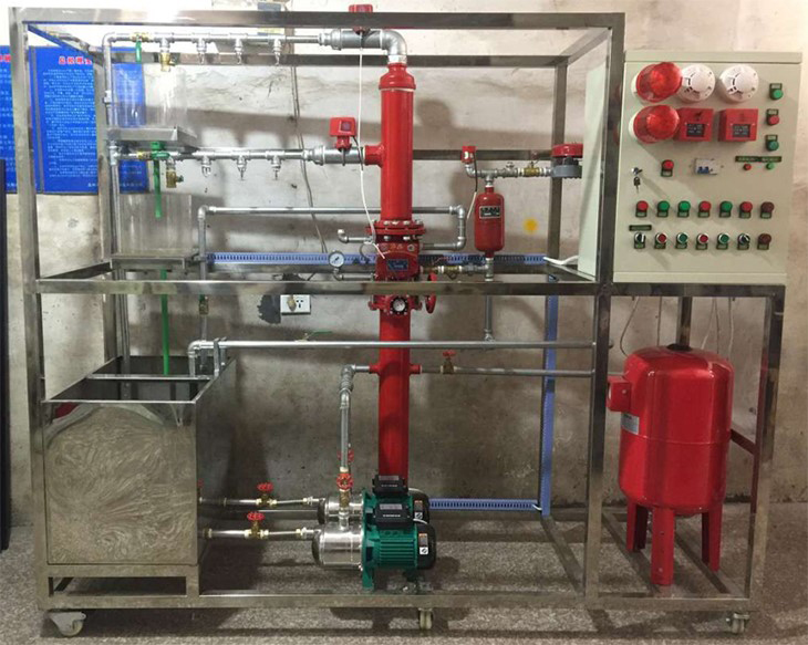 2.模型框架和水箱等主要部件全部使用不銹鋼器件,保證不生銹、不易老化,模擬兩層大樓噴淋滅火系統(tǒng);模型系統(tǒng)主要由噴淋水泵、氣壓罐、濕式報警閥、水力警鈴、延時器、壓力開關(guān)、水流指示器、封閉式噴頭、試驗閥、火災(zāi)探測器、火災(zāi)報警器等典型噴水滅火設(shè)備構(gòu)成,能生動模擬大樓內(nèi)水滅火系統(tǒng)的典型結(jié)構(gòu)。
