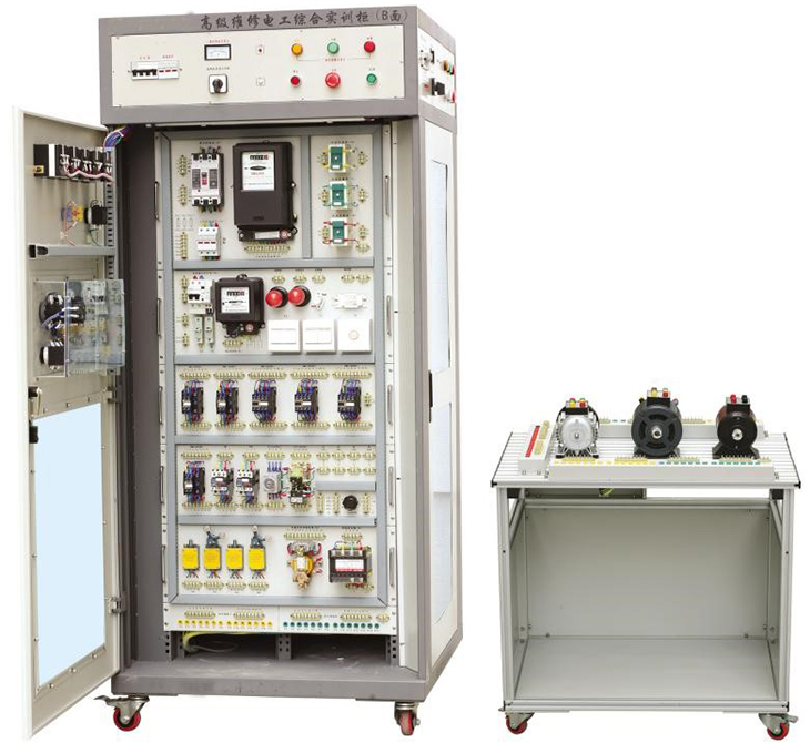 高級維修電工綜合實訓(xùn)柜,電工實訓(xùn)操作臺是根據(jù)中、高級維修電工應(yīng)具備的技能要求進行設(shè)計的,并適當增加了新技術(shù)。包含了繼電接觸控制、低壓配電、儀表照明、電機拖動、可編程控制器、觸摸屏、變頻調(diào)速、直流調(diào)速、電力電子、自動控制等技術(shù)。提高學(xué)生對電氣系統(tǒng)的施工設(shè)計、工藝安裝、接線調(diào)試、程序設(shè)計、運行維護、故障維修等綜合能力?蛇M行維修電工基本技能和核心技能的訓(xùn)練,也可以進行創(chuàng)新技能的拓展訓(xùn)練,完成多層次的考核,切實提高學(xué)生的技能水平。