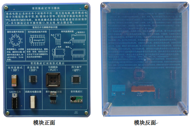 底盒使用190mm×145mm的開模有機透明塑料底盒,模塊面板采用印制電路板PCB工藝,可以直觀看到器件的實物及相關的原理介紹。對于易損器件安裝在面板背面,透過透明底盒能夠看到器件實物,方便感性認識、檢測測試,同時也能防止器件的損傷。