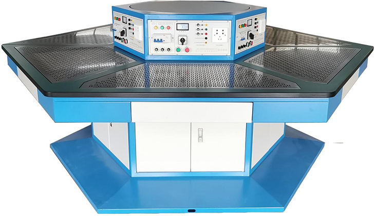 六邊形電源控制屏:電源控制屏采用六邊形結(jié)構(gòu),與工作臺相對應(yīng)?蚣懿捎30 R的半圓形鋁型材經(jīng)過專用連接件組裝,頂面與底面采用1.2mm厚的優(yōu)質(zhì)鋼板連接。六個作業(yè)面均配置有實(shí)訓(xùn)電源及主機(jī)控制系統(tǒng),控制面板按鍵為薄膜輕觸式設(shè)計,具有漏電保護(hù)、短路保護(hù)功能。電源控制屏頂面采用10mm厚的鋁框包邊,內(nèi)置有直徑為850mm的多角度公共操作平臺,公共操作平臺能360°旋轉(zhuǎn),能做60°定位,平臺頂板采用10mm厚的鋁板加工成型,能載重約80Kg的典型工作任務(wù)。