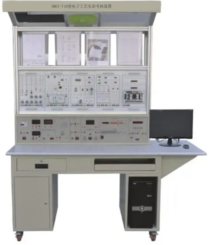 電子工藝實訓臺主要由實訓桌、實訓面板、鋁合金框架、頂部框架等組成。