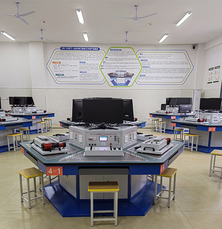電工技能工作島由六邊形工作臺、六邊形電源控制屏及典型工作任務組成,能同時容納6名學生在設備上進行操作。