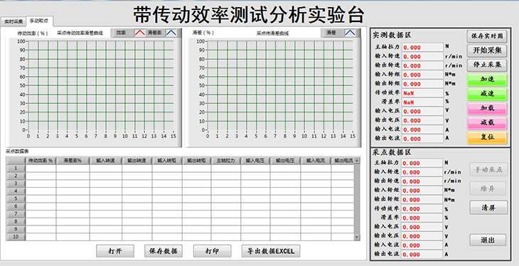 2、通過觸摸屏顯示面板顯示面板讀數(shù)進行平皮帶傳動效率的測定,人工繪制滑差曲線和效率曲線。