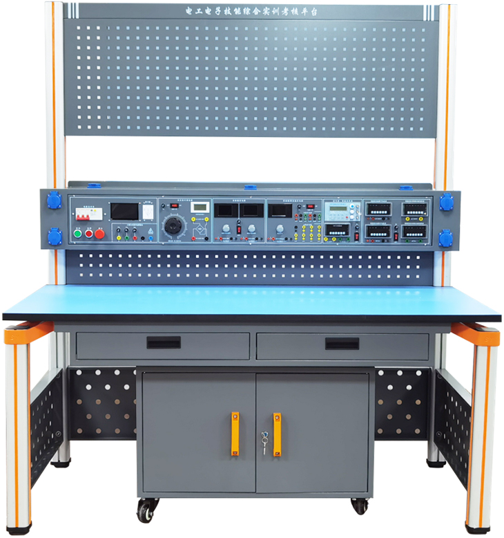 電工電子技能綜合實訓裝置由實驗主機箱、儀器架、實訓桌、移動矮柜、電工電子實訓套件、學生凳等組成。實驗裝置支架與實驗桌可組合、可拆裝。支架與桌腳一體,鋁合金結構。