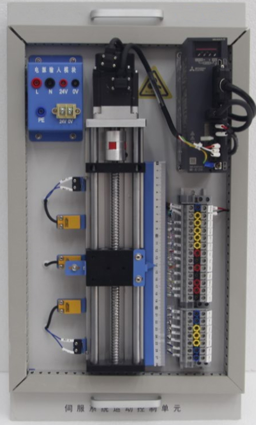 2)對(duì)象:包含滾珠絲桿、聯(lián)軸器、刻度尺(0-270mm)1個(gè)、限位開(kāi)關(guān)(滾動(dòng)式)2個(gè)、接近開(kāi)關(guān)(光電)3個(gè)、安裝底板、控制接口等。可完成伺服系統(tǒng)參數(shù)的設(shè)置、電機(jī)正反轉(zhuǎn)控制、定位控制等。