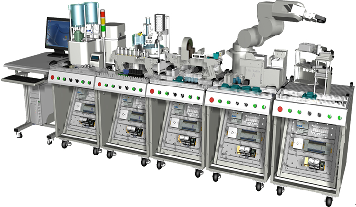 機電一體化綜合實訓(xùn)考核系統(tǒng)是基于國家中長期人才發(fā)展規(guī)劃綱要,對經(jīng)濟社會發(fā)展重點領(lǐng)域急需緊缺專門人才培養(yǎng)的需要,依據(jù)國家相關(guān)職業(yè)工種培養(yǎng)及鑒定標(biāo)準,結(jié)合中國當(dāng)前制造業(yè)的崗位需求設(shè)計研發(fā)。機電一體化綜合實訓(xùn)考核系統(tǒng)由"工作站"形式綜合體現(xiàn),"工作站"包含機電一體化"工作島",電氣裝配臺,機械裝配臺,工具、資料柜及其他附屬工作設(shè)施,不但讓操作者在工作中實習(xí)訓(xùn)練了機電專業(yè)技能,同時也體驗到職業(yè)素養(yǎng)中的社會能力與方法能力。"工作站"的核心是"工作島",由MPS模塊化生產(chǎn)線設(shè)備組成,共分為液體混合灌裝、組裝加工、檢測判別、機器人和智能倉儲五個工作島設(shè)備組成,工作島由PLC、變頻器、伺服驅(qū)動、步進驅(qū)動、氣動元件、觸摸屏等工業(yè)控制器件構(gòu)成,操作者需要具備機械裝調(diào)、電氣管路連接、程序設(shè)計、機器人操作、傳感器裝調(diào)、檢修排故、觸摸屏組態(tài)等現(xiàn)代制造業(yè)崗位必要的技能,設(shè)備技術(shù)涵蓋面廣,定位具有前瞻性,是機電一體化專業(yè)教學(xué)實習(xí)、技能鑒定和技能競賽的絕佳載體。