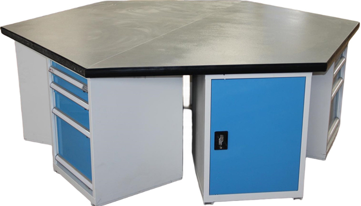 六角鉗工臺(tái)的工位長(zhǎng)為1.2米,每臺(tái)由兩個(gè)梯形鉗工臺(tái)拼成,共有18實(shí)訓(xùn)工位。 |
