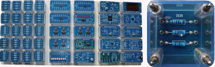 *9、透明電子技術(shù)模塊:由120個透明模組成,模塊塊使用透明的元件盒子,可以正反觀察電子元件組成,各個電子元件分別安裝在PCB板上,做實(shí)驗(yàn)時可以用導(dǎo)線連接,可以學(xué)習(xí)電子電路基礎(chǔ)、數(shù)字電路技術(shù)、電力電子技術(shù),直流穩(wěn)壓電源技術(shù)、電壓測量等家電電路上的常用控制電路。