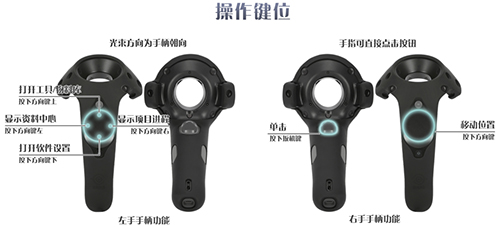 工業(yè)電梯安裝VR實(shí)訓(xùn)系統(tǒng)中所有交互均采用虛擬現(xiàn)實(shí)頭顯和手柄完成。其中頭顯的主要功能是控制場(chǎng)景中人物的位置和屏幕顯示的方向,手柄的主要功能包括與界面交互的"扳機(jī)建"、移動(dòng)手柄進(jìn)行觸碰、左手點(diǎn)擊輪盤進(jìn)行呼出和移動(dòng)功能鍵。