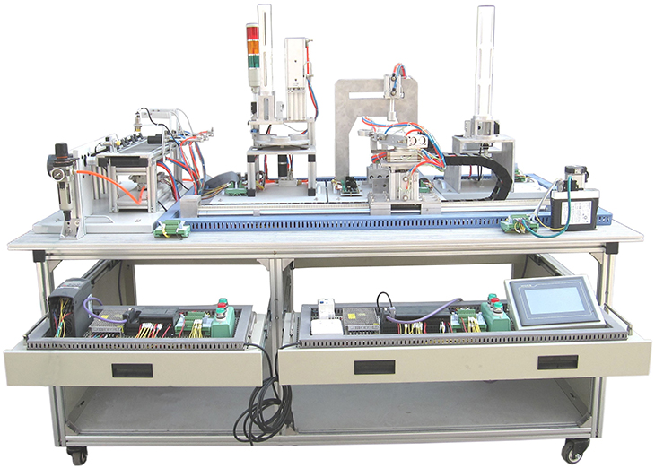 光機(jī)電氣一體化實(shí)訓(xùn)裝置由鋁合金導(dǎo)軌式實(shí)訓(xùn)臺、典型的機(jī)電一體化設(shè)備的機(jī)械部件、PLC模塊、變頻器模塊、按鈕模塊、電源模塊、模擬生產(chǎn)設(shè)備實(shí)訓(xùn)模塊、接線端子排和各種傳感器、計(jì)算機(jī)等組成。整體結(jié)構(gòu)采用開放式和拆裝式,實(shí)訓(xùn)裝置用于機(jī)械部件組裝,可根據(jù)現(xiàn)有的機(jī)械部件組裝生產(chǎn)設(shè)備,也可添加機(jī)械部件組裝其他生產(chǎn)設(shè)備,使整個裝置能夠靈活的按教學(xué)或競賽要求組裝具有生產(chǎn)功能的機(jī)電一體化設(shè)備。模塊采用標(biāo)準(zhǔn)結(jié)構(gòu)和抽屜式模塊放置架,互換性強(qiáng);按具有生產(chǎn)性功能和整合學(xué)習(xí)功能的原則確定模塊內(nèi)容,使教學(xué)或競賽時(shí)可方便的選擇需要的模塊。設(shè)備需完全符合電工電子全國職業(yè)技能大賽所要求,同時(shí)還要求具有可拓展功能,可以組成更加大型的生產(chǎn)模擬系統(tǒng),以配合各個用戶學(xué)校不同層次,不同專業(yè)的教學(xué)及培訓(xùn)要求。
