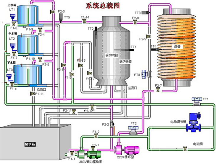 實驗對象系統(tǒng)包含有:不銹鋼儲水箱;上、中、下三個串接有機(jī)玻璃圓筒型水箱;三相4.5kW電加熱鍋爐(由不銹鋼鍋爐內(nèi)膽加溫筒和封閉式外循環(huán)不銹鋼冷卻鍋爐夾套構(gòu)成)和鋁塑盤管組成。