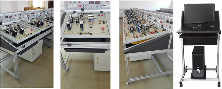 實驗操作面:采用工業(yè)鋁型材,連接實驗臺與電源控制屏,與實驗臺成36度斜面。內(nèi)置機(jī)床電氣模塊放置區(qū),采用鋼材做骨架,外表面噴涂彩色環(huán)氧聚塑。