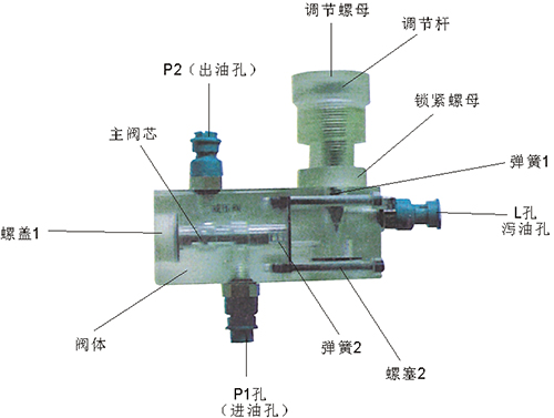 2、溢流閥結構上參考了國產P-63B型低壓直動式溢流閥,其閥體閥蓋、鎖緊螺母、調節(jié)螺母、螺塞等采用了進口透明有機玻璃材料精制而成,閥芯、調節(jié)桿采用了45#中碳鋼材料。并配合彈簧,油接頭,密封圈等標準件裝配而成,通過它可明確地觀察到閥芯、彈簧、油孔等結構及其運行過程,具有形象逼真,性能可靠等優(yōu)點。它即可作為教學模型,也可以作為液壓實驗元件進行實驗演示。