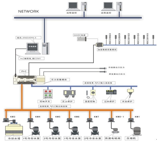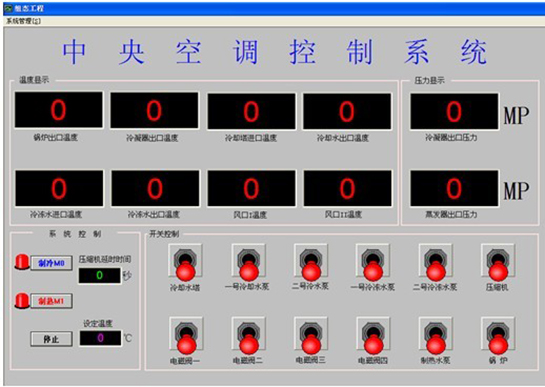 PLC可編程控制器及工業(yè)總線(xiàn)控制,由計(jì)算機(jī)通過(guò)通信總線(xiàn)與PLC進(jìn)行通信,控制整個(gè)中央空調(diào)的運(yùn)行?照{(diào)的運(yùn)行參數(shù)由各類(lèi)傳感器進(jìn)行采集,并通過(guò)通信總線(xiàn)送入計(jì)算機(jī)中,通過(guò)專(zhuān)用中央空調(diào)組態(tài)控制軟件進(jìn)行實(shí)時(shí)監(jiān)控。組態(tài)軟件要求能夠以動(dòng)畫(huà)的形式同步顯示系統(tǒng)的設(shè)備結(jié)構(gòu)、控制原理和流程。