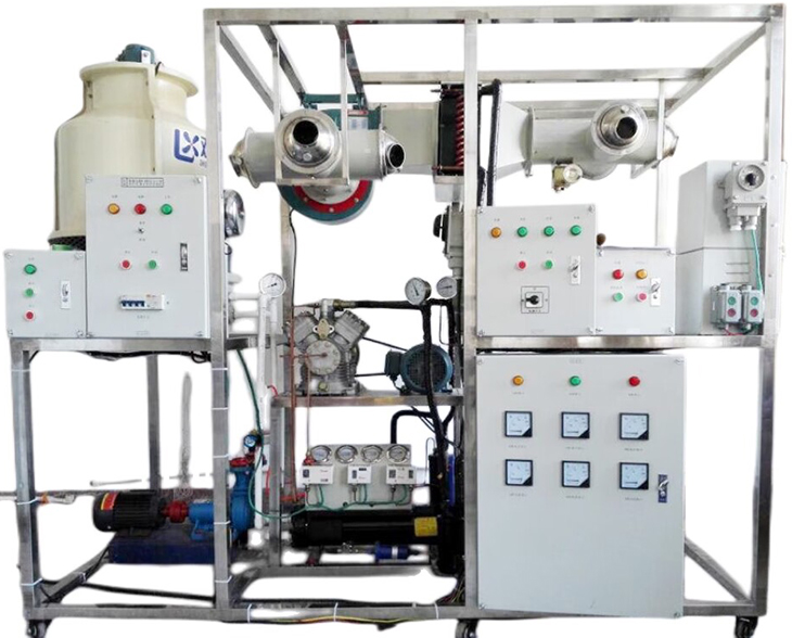實訓(xùn)裝置主要由控制臺、水冷制冷機組、高溫風(fēng)機,風(fēng)機管道,管道調(diào)節(jié)閥門、主機實訓(xùn)模塊、連軸式冷卻水泵,冷卻塔,溫度和壓力傳感器等組成溫度和壓力表等組成