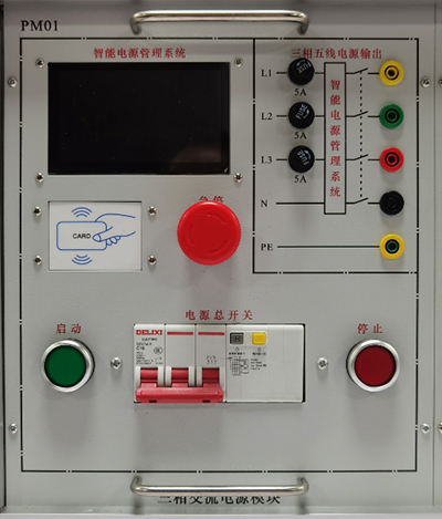 (1)提供線電壓380V交流電源、相電壓220V交流電源。交流電源輸出設(shè)有電源保護(hù)系統(tǒng),相間、線間過電流及直接短路均能自動(dòng)保護(hù)。提供三相漏電保護(hù)器作為整個(gè)實(shí)驗(yàn)平臺(tái)的電源總開關(guān)。三相輸出通過停止和啟動(dòng)按鈕控制。