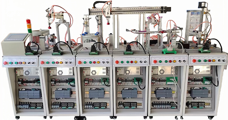 系統(tǒng)由六個站組成,分別為:上料檢測站、搬運站、加工站、搬運安裝站、安裝站和分類站,控制系統(tǒng)可以選用西門子、三菱的PLC進行控制,具有較好的柔性,即每站各有一套PLC控制系統(tǒng)獨立控制,在單個培訓(xùn)完成以后,又可以將相鄰的兩站、三站…直至六站連在一起,學(xué)習(xí)復(fù)雜系統(tǒng)的設(shè)計、安裝、編程、調(diào)試和整機運行。