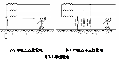 人體某一部位觸及一相帶電體,電流通過人體流入大地(流回中性線),稱為單相觸電,如圖1.1所示。單相觸電時(shí)人體承受的最大電壓為相電壓。單相觸電的危險(xiǎn)程度與電網(wǎng)運(yùn)行的方式有關(guān)。在電源中性點(diǎn)接地系統(tǒng)中,由于人體電阻遠(yuǎn)大于中性點(diǎn)接地電阻,電壓幾乎全自加在人體上;而在中性點(diǎn)不直接接地系統(tǒng)中,正常情況下電源設(shè)備對地絕緣電阻較大,通過人體的電流較小。所以,一般情況下,中性點(diǎn)直接接地電網(wǎng)的單相觸電比中性點(diǎn)不直接接地的電網(wǎng)危險(xiǎn)性大。