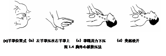 使擠壓到位的手掌突然放松,但手掌不要離開胸壁,依靠胸部的彈性自動(dòng)回復(fù)原狀,使心臟自然擴(kuò)張,大靜脈中的血液就能回流到心臟中來。按照上述步驟不斷的進(jìn)行,每秒一次,每分鐘約60次,如圖1.4所示。擠壓時(shí)定位要準(zhǔn)確,壓力要適中,不要用力過猛,避免造成肋骨骨折、氣胸、血胸等危險(xiǎn)。但也不能用力過小,達(dá)不到擠壓目的。