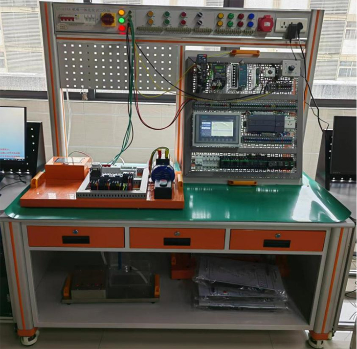 電氣自動化高級實訓平臺包含實訓平臺、控制掛板、應用模塊、電腦桌、圓凳三部分組成,實訓平臺采用優(yōu)質(zhì)鋁型材做骨架,鋁型材立柱與實訓桌面連接。左右兩側(cè)及后面封裝優(yōu)質(zhì)鋼板,正面設(shè)計儲物柜與抽屜。