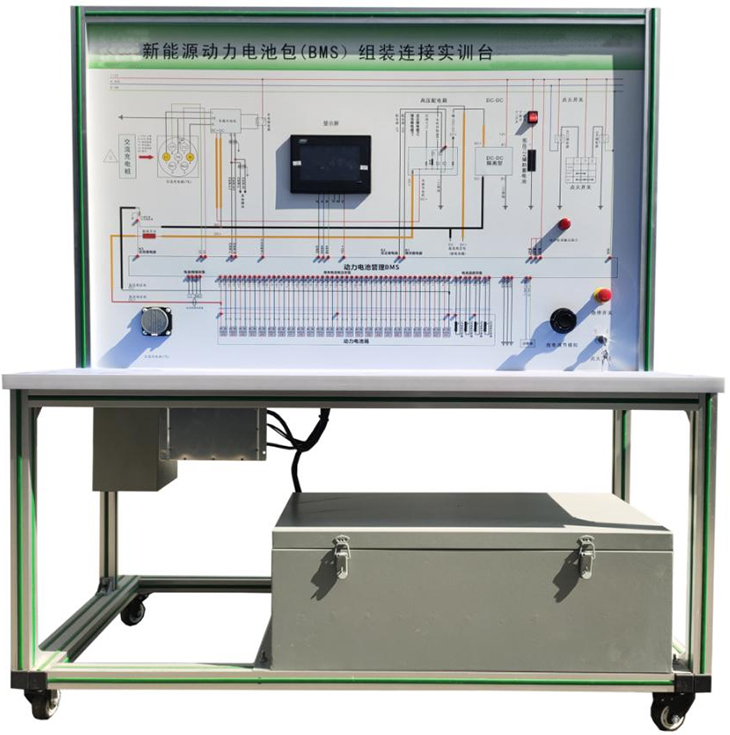 磷酸鐵鋰動(dòng)力電池包、實(shí)驗(yàn)連接導(dǎo)線、BMS鋰電管理一體機(jī)、7寸動(dòng)力電池包觸摸顯示屏、車載充電機(jī)、國(guó)標(biāo)充電插口、國(guó)標(biāo)充電槍、緊急斷電開(kāi)關(guān)、霍爾電流傳感器、直流接觸器(包含充電繼電器、總正繼電器、總負(fù)繼電器、預(yù)充繼電器)、DC-DC轉(zhuǎn)換器、輔助蓄電池(12V45AH)、放電控制繼電器與放電負(fù)載、預(yù)充電阻、一體化全鋁合金型材搭建的移動(dòng)臺(tái)架(1500×700×1700mm 帶自鎖腳輪裝置,帶安裝檢測(cè)端子的原理面板,面板1448×940mm)、設(shè)備操作說(shuō)明書(shū)。