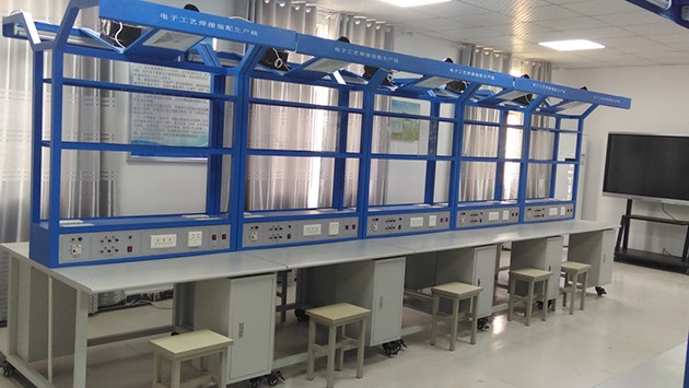 電子設(shè)計(jì)及操作實(shí)訓(xùn)臺(tái)上提供日光燈(用于照明)2個(gè),透明的PVC板8個(gè),可夾放原理圖等資料,另外還配備三芯雙聯(lián)暗插座4個(gè)、兩芯暗插座4個(gè)、工具柜4個(gè),工作臺(tái)面設(shè)有綠色防靜電桌墊,整個(gè)裝配線安全可靠。