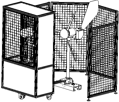 葉片、輪轂、發(fā)電機(jī)、機(jī)艙、尾舵和側(cè)風(fēng)偏航控制機(jī)構(gòu)組裝成水平軸永磁同步風(fēng)力發(fā)電機(jī),安裝在塔架上。風(fēng)場由軸流風(fēng)機(jī)、軸流風(fēng)機(jī)支架、軸流風(fēng)機(jī)框罩、測速儀、測速儀支架、風(fēng)場運(yùn)動機(jī)構(gòu)箱體、傳動齒輪鏈機(jī)構(gòu)、單相交流電動機(jī)、滾輪和萬向輪等組成。軸流風(fēng)機(jī)和軸流風(fēng)機(jī)框罩安裝在風(fēng)場運(yùn)動機(jī)構(gòu)箱體上部,傳動齒輪鏈機(jī)構(gòu)、單相交流電動機(jī)、滾輪和萬向輪組成風(fēng)場運(yùn)動機(jī)構(gòu)。當(dāng)風(fēng)場運(yùn)動機(jī)構(gòu)中的單相交流電動機(jī)旋轉(zhuǎn)時,傳動齒輪鏈機(jī)構(gòu)帶動滾輪轉(zhuǎn)動,風(fēng)場運(yùn)動機(jī)構(gòu)箱體圍繞風(fēng)力發(fā)電機(jī)的塔架作圓周旋轉(zhuǎn)運(yùn)動,當(dāng)軸流風(fēng)機(jī)輸送可變風(fēng)量風(fēng)時,在風(fēng)力發(fā)電機(jī)周圍形成風(fēng)向和風(fēng)速可變的風(fēng)場。