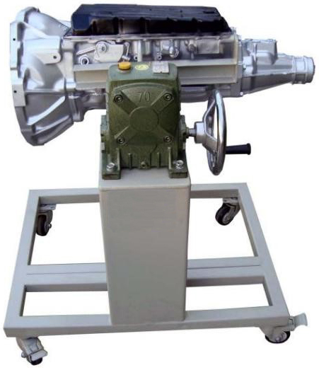 采用減速翻轉(zhuǎn)機(jī)構(gòu),可使變速器旋轉(zhuǎn)任意角度,并能任意位置鎖止,便于學(xué)生從不同的角度進(jìn)行拆卸和裝配。