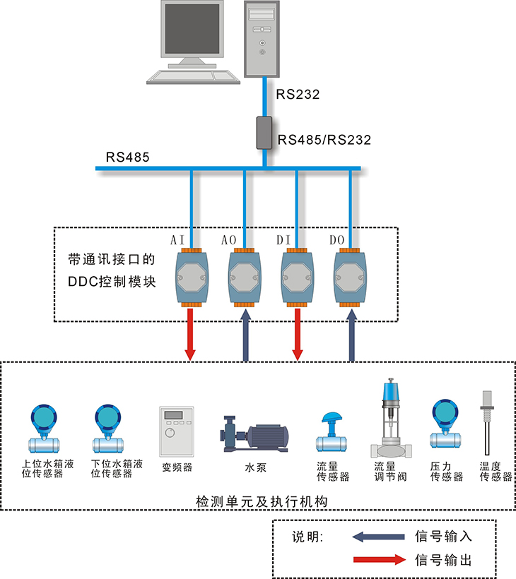 DDC控制系統(tǒng)一般有兩種形式,一種采用外部數(shù)據(jù)采集模塊的形式,其核心為帶RS485通訊的數(shù)據(jù)采集模塊和計(jì)算機(jī)算法軟件;另一種采用工控機(jī)和ISA或PCI插槽的數(shù)據(jù)采集板卡。外部數(shù)據(jù)采集模塊由于安裝方便,同時(shí)就地安裝時(shí)采用通訊方式向計(jì)算機(jī)送數(shù)據(jù)不存在信號(hào)衰減,因此本產(chǎn)品采用第一種方式的應(yīng)用。用戶可根據(jù)自己學(xué)校的實(shí)際情況選用第二種方式的應(yīng)用(例如研華A/D、D/A、采樣板卡)。