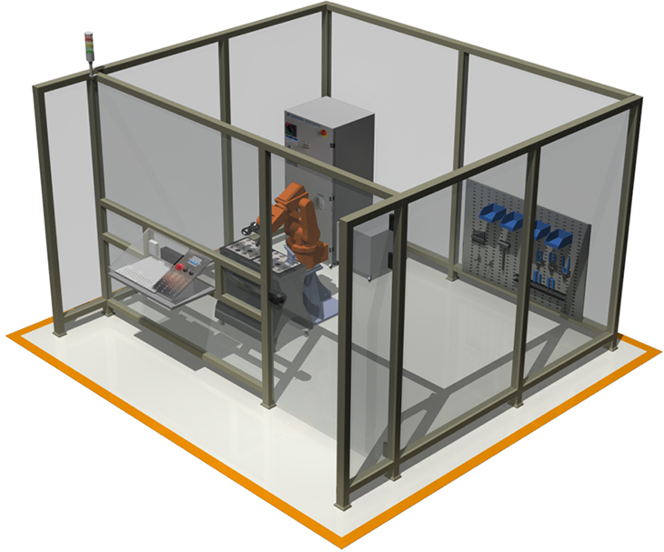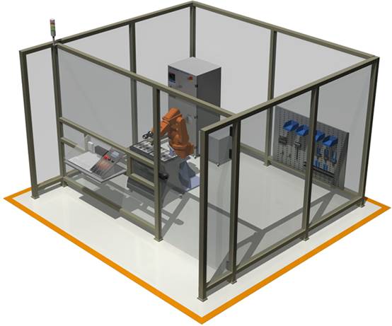 安全護(hù)欄:隔離護(hù)欄,高1000mm,框架采用2mm厚灰色棟梁鋁合金型材,鋼化玻璃10mm厚;工作站全部通透利于觀察,玻璃中間沒有隔斷;并安裝一個(gè)側(cè)開門;門上安裝安全檢測(cè)元件,機(jī)器人自動(dòng)運(yùn)行必須在門關(guān)閉狀態(tài)下進(jìn)行;系統(tǒng)工作站安裝有3個(gè)急停按鈕,分別位于操作控制臺(tái)、模型安裝臺(tái)、隔離護(hù)欄上,以備緊急情況使用。