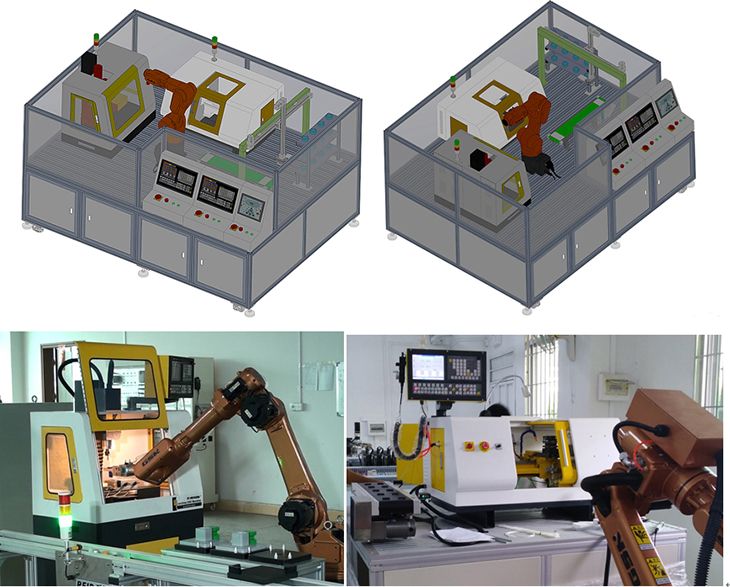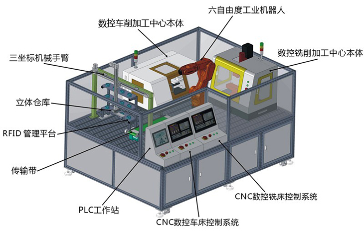 本套設(shè)備是以小型的柔性制造系統(tǒng)為載體,主要特點(diǎn)是占地空間小、操作安全、涉及的知識(shí)點(diǎn)豐富、綜合,系統(tǒng)性強(qiáng)、成本低、師生容易上手等;主要是由一臺(tái)工業(yè)6軸自由度機(jī)器人、一臺(tái)三坐標(biāo)機(jī)械手臂、一臺(tái)柔性數(shù)控車床、一臺(tái)柔性數(shù)控銑床、RFID系統(tǒng)、PLC工作站、智能倉(cāng)庫(kù)、中控臺(tái)、傳輸帶等部份組成,實(shí)現(xiàn)自動(dòng)化上下料、加工等無(wú)人工作環(huán)節(jié),機(jī)器人按指令分別給兩臺(tái)機(jī)器送料取料;該系統(tǒng)能夠?qū)崿F(xiàn)工業(yè)機(jī)器人上下料工作站系統(tǒng)的編程、上下料系統(tǒng)的集成、RFID系統(tǒng)應(yīng)用、PLC系統(tǒng)編程、數(shù)控車床編程加工、數(shù)控銑床編程加工、現(xiàn)場(chǎng)總線的通訊實(shí)訓(xùn)等環(huán)節(jié)。讓學(xué)生輕松掌握工業(yè)6軸機(jī)器人上下料與數(shù)控機(jī)床組建柔性加工生產(chǎn)系統(tǒng),能滿足學(xué)生對(duì)工業(yè)機(jī)器人學(xué)習(xí)及操作的需要,學(xué)生通過(guò)該套系統(tǒng)的學(xué)習(xí)與訓(xùn)練,對(duì)智能生產(chǎn)無(wú)人工廠的組建整體性應(yīng)用有全面的了解與體驗(yàn)。
