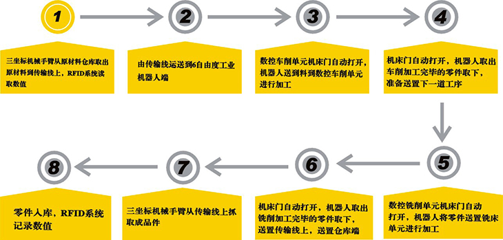 三坐標(biāo)機(jī)械手臂從原材料倉(cāng)庫(kù)取出原材料到傳輸線上,RFID系統(tǒng)讀取數(shù)值,由傳輸線運(yùn)送到6自由度工業(yè)機(jī)器人端,由負(fù)責(zé)數(shù)控機(jī)床的上下料工作,數(shù)控車削單元將零件加工完畢后,機(jī)床自動(dòng)開門,零件由機(jī)器人送置到數(shù)控銑削加工中心進(jìn)行加工下一道工序,加工完畢后銑床自動(dòng)開門,由機(jī)器人取出成品零件送置到傳輸帶上,輸送到智能倉(cāng)庫(kù)端,由三坐標(biāo)機(jī)械手臂將成品零件入庫(kù),RFID系統(tǒng)讀取數(shù)值。學(xué)生在熟練掌握該系統(tǒng)的操作與編程以后,也可以對(duì)零件類型和加工工藝進(jìn)行調(diào)整。