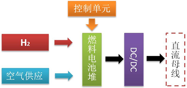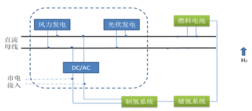 其工作原理是風(fēng)力、光伏發(fā)電系統(tǒng)發(fā)電,并由電池儲能,由儲能逆變系統(tǒng)轉(zhuǎn)換成交流電后接入電網(wǎng),燃料電池單元所發(fā)的電能經(jīng)DC-DC轉(zhuǎn)換后送入直流總線作后備儲能;系統(tǒng)可離網(wǎng)運(yùn)行亦可并網(wǎng)運(yùn)行,在網(wǎng)端能耗負(fù)荷內(nèi)完成削峰填谷功能。