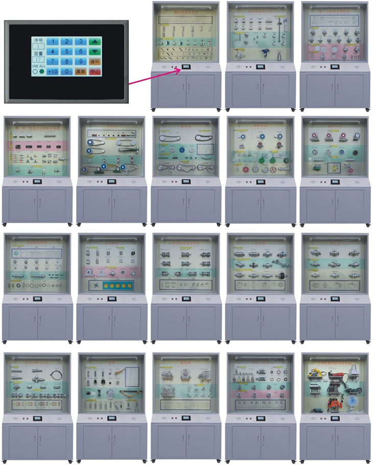 機(jī)械設(shè)計(jì)零件陳列柜,是根據(jù)機(jī)械設(shè)計(jì)(零件)課程基本要求設(shè)計(jì)制造的實(shí)驗(yàn)設(shè)備。陳列柜通過機(jī)械零件模型或?qū)嵨铮浜舷鄳?yīng)的圖文資料,形象地展示與解說機(jī)械設(shè)計(jì)的基本知識,加強(qiáng)學(xué)生對通用機(jī)械零件的類型、結(jié)構(gòu)特點(diǎn)及其設(shè)計(jì)的感性認(rèn)知,為進(jìn)一步學(xué)習(xí)機(jī)械設(shè)計(jì)奠定基礎(chǔ)。